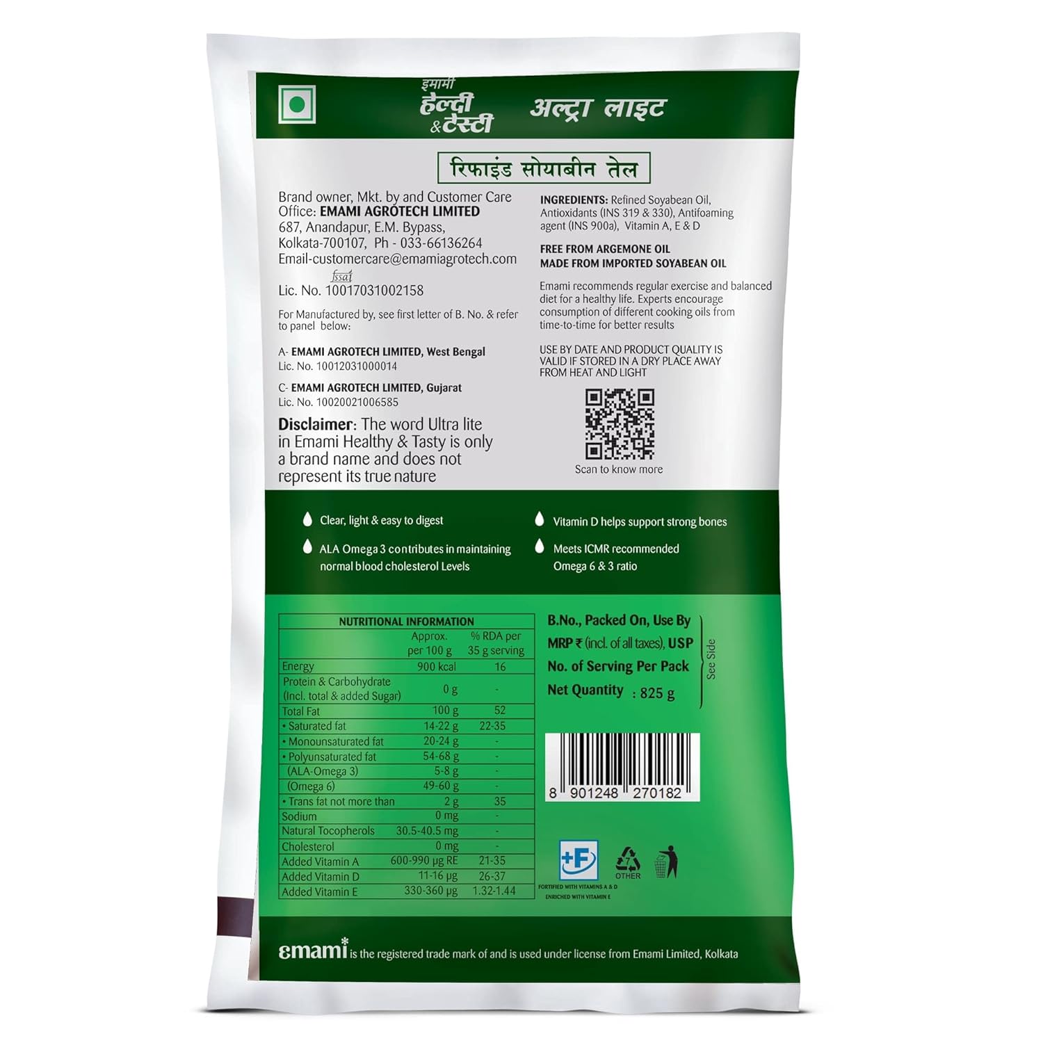 About this item Ultra Lite, a delightful way of cooking: Change the way how you cook your everyday meals with Emami Healthy & Tasty Ultra Lite Refined Soyabean Oil. This cooking oil does not make your delicious meals heavy or greasy. Emami Healthy & Tasty Ultra Lite Soyabean Oil is one of the lightest oils in the category of healthy cooking oils. Very light in colour and doesn’t interfere with the taste of food. Easy to Digest: Being so light, Emami Ultra Lite gets absorbed less while frying and makes food less sticky, thus making your snacks light and helping you stay active and energetic post meals. Being a healthy cooking option, it’s suitable for everyday use. Contains the goodness of soya oil and Vitamin A, D & E. Vitamin A helps in strengthening immunity. Vitamin D supports strong bones. Vitamin E helps maintain healthy skin. Perfect for Indian Kitchens: Soyabean oil has a high smoke point and therefore is suitable for high-heat cooking like roasting, baking, frying and sautéing. 100% Vegetarian Ultra Lite is only a brand name and does not represent its true nature